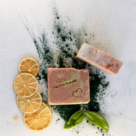 Aceites saponificados de Olivo, Coco y Ricino, Manteca de Karité y Cacao. Aceites esenciales de Bergamota y Albahaca, Espirulina, Polvo de Riubarbo y Oleato de Albahaca.